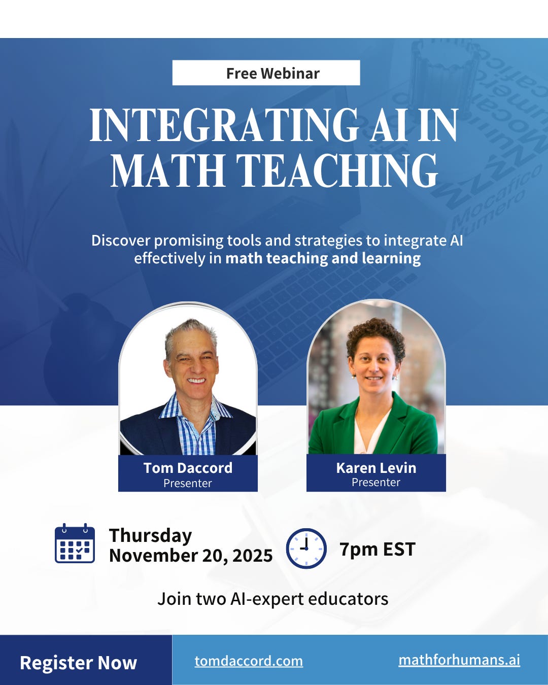 Join Karen Levin and me for tonight’s free webinar on Integrating AI in Math Teaching.