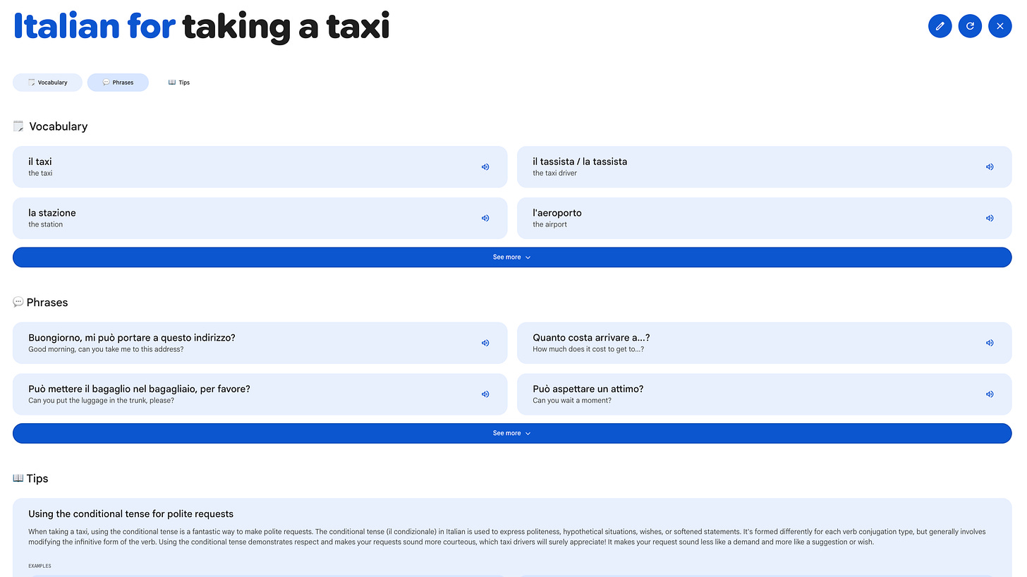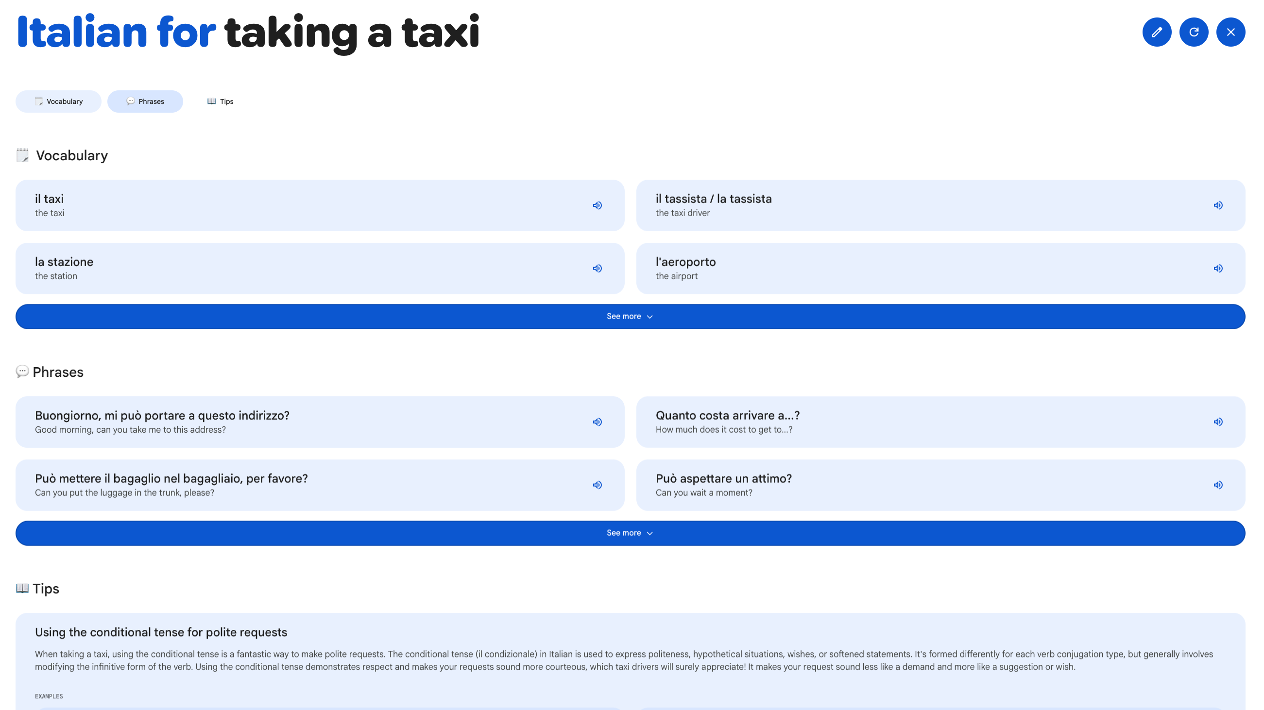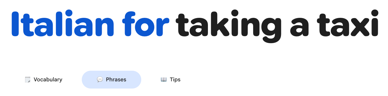 In this example, I direct Tiny Lessons to generate words, phrases, and tips for “taking a taxi” in Italy. I click/tap “Continue” and the next page displays a vocabulary, phrases, and grammar relevant to that scenario.