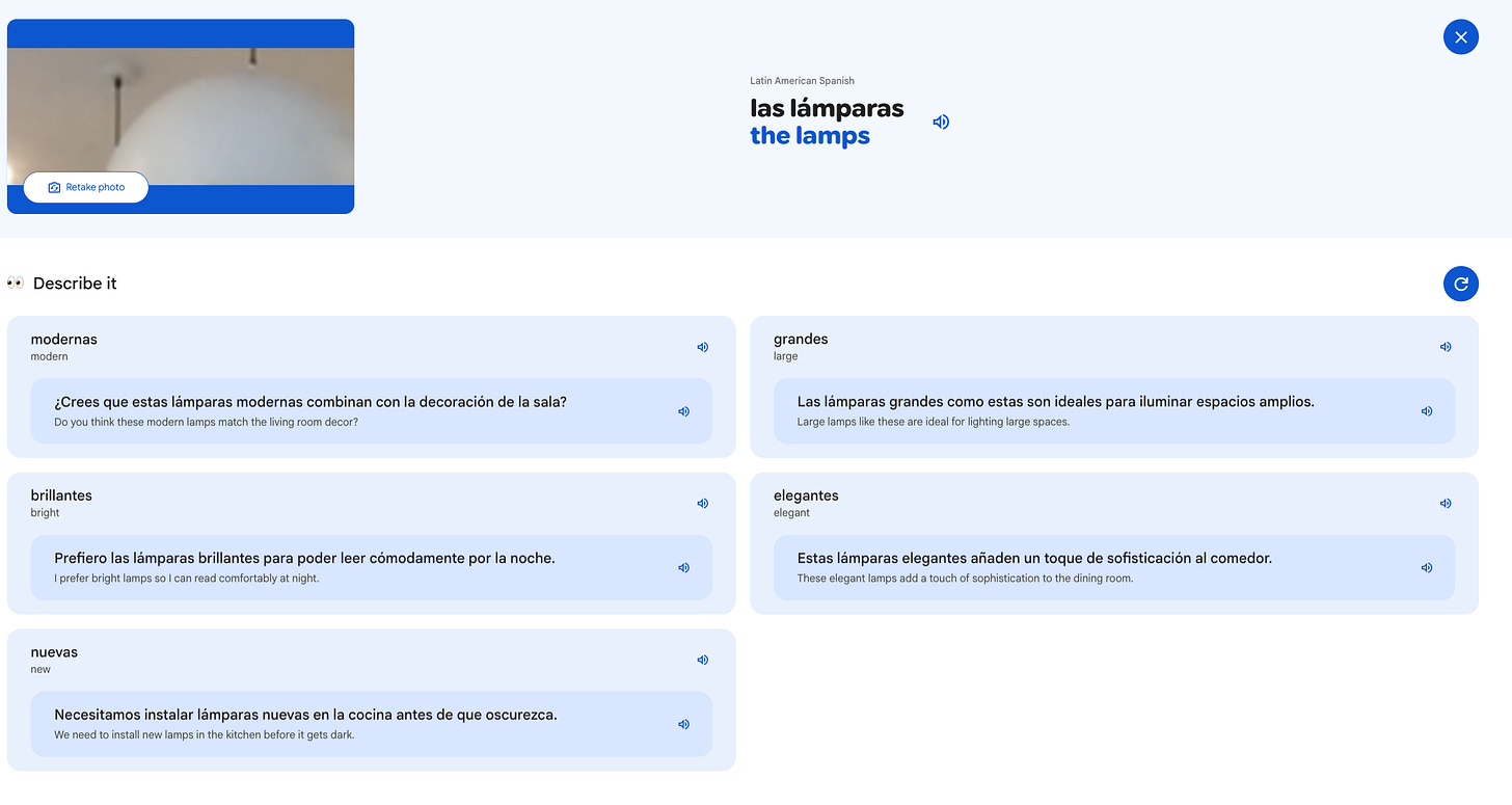 You can click/tap on any label to discover relevant phrases for that object. I clicked on “las lámparas” (the lamps) and it proceeded to provide me with several useful words to describe las lámparas — along with examples: