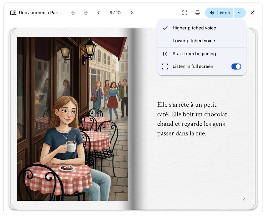 Gemini Storybooks enables you to create an illustrated, narrated, 10-page digital book in more than 45 languages. You can specify the level, tone, characters, and art style, and you can even let Gemini draw on your photos/files for personalization. Gemini Storybooks creates storybooks quickly (often under a minute).