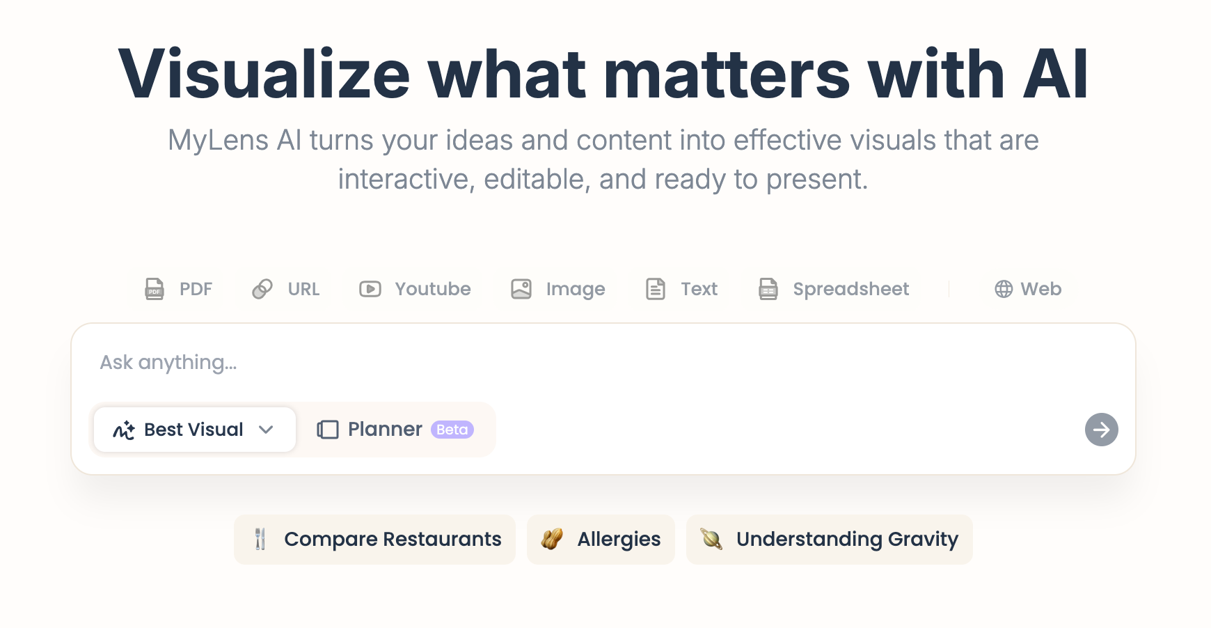 With MyLens, you simply drop in a source — text, PDFs, videos, webpages, spreadsheets, or even a prompt — and it instantly turns the source into a clear, editable visual. (Data is not used for model training; only to create your visual.)