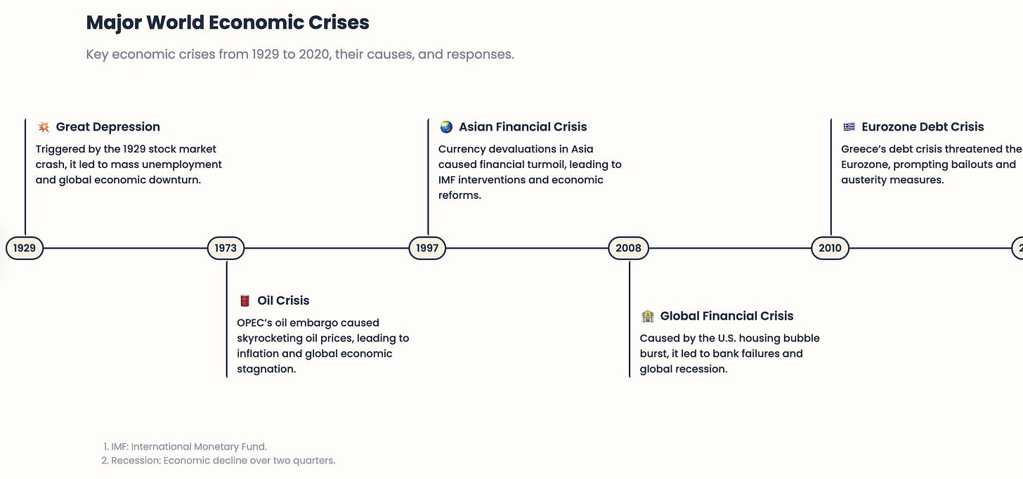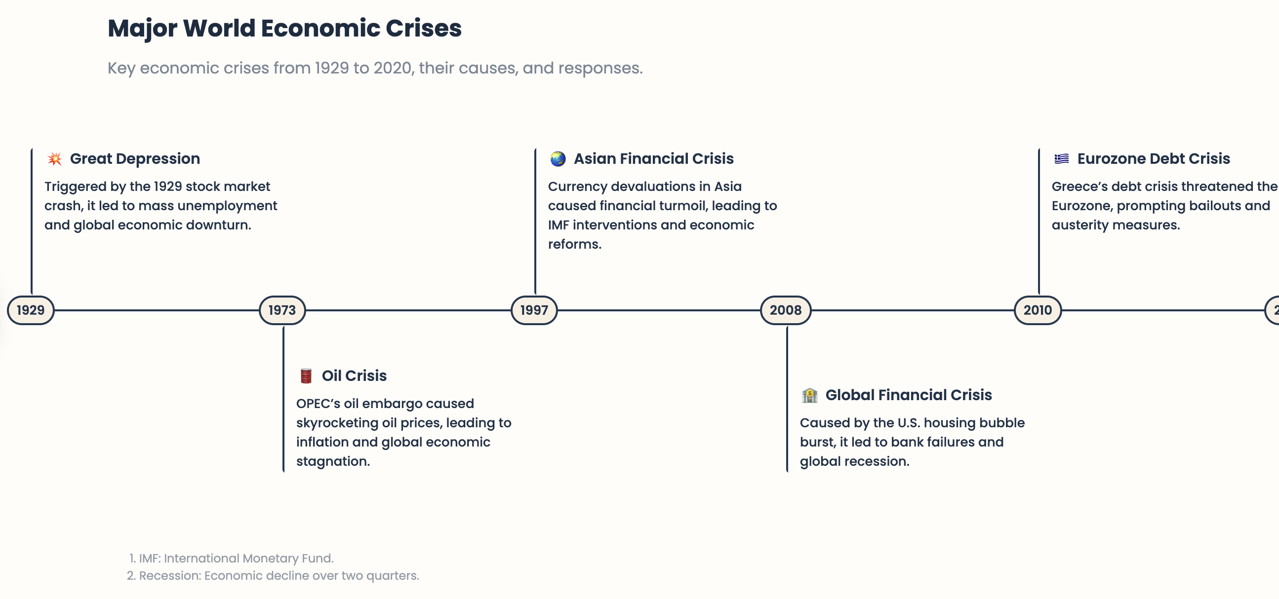 Build a timeline of major world economic crises — with causes, policy responses, and outcomes — appropriate for an upper-level high school economics course.