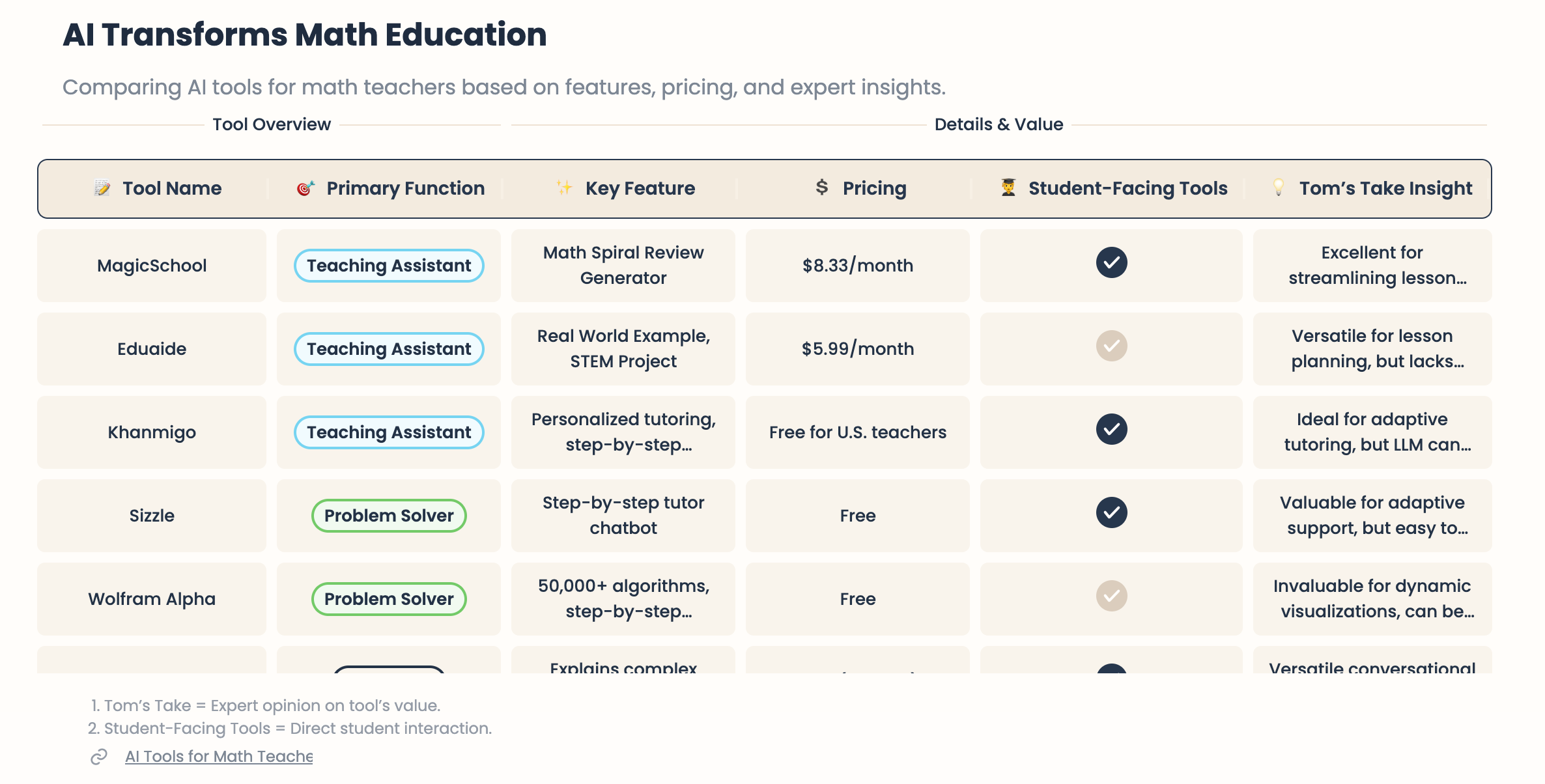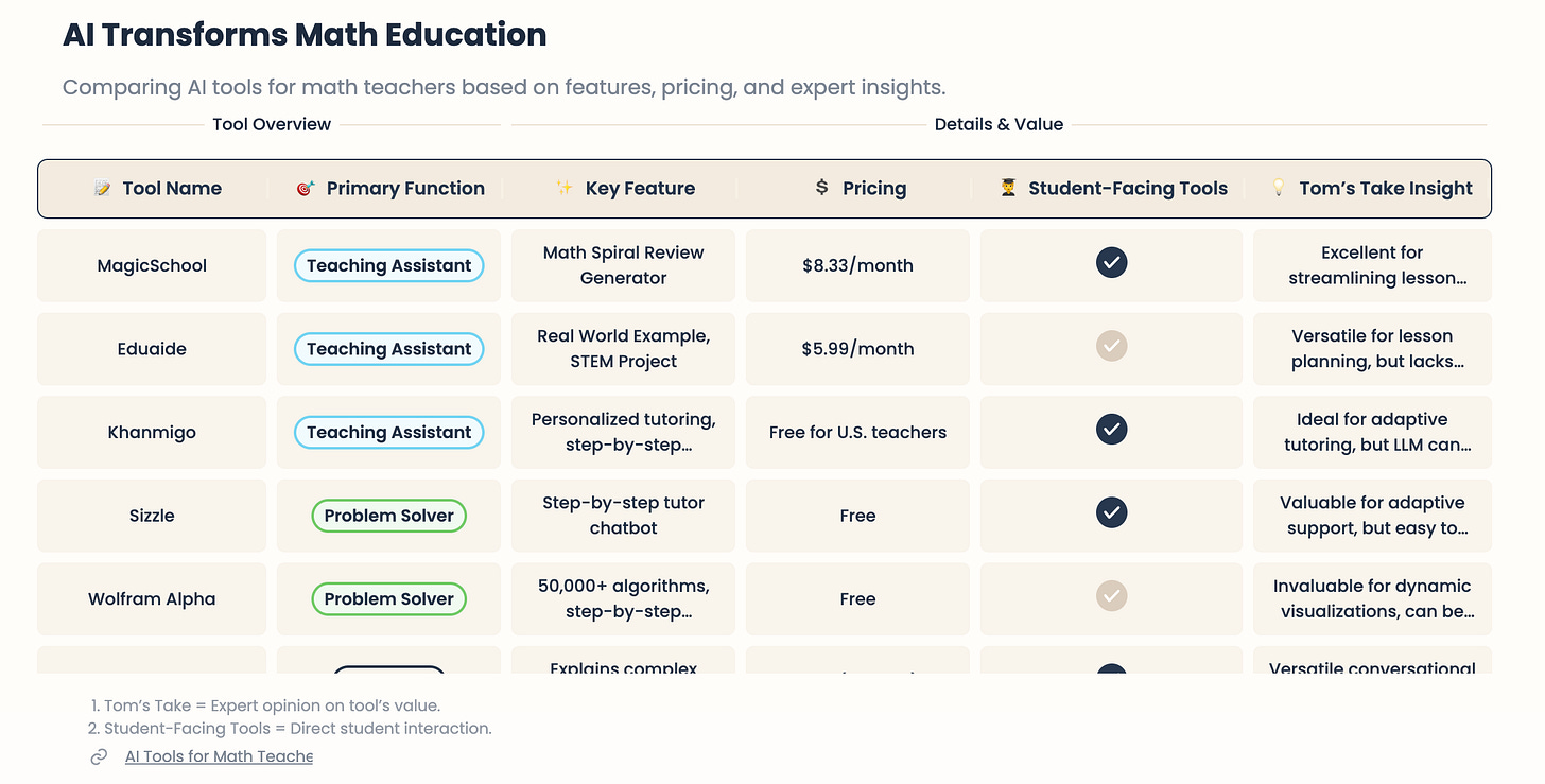 MyLens created a concise and accessible guide to (some) of the tools featured at AI Tools for Math Teachers. It listed 8 tools in total (5 are pictured above), fewer than I would have wanted, but appropriately brief and digestible. I like the design, organization, and color scheme, though I now need to edit some information.