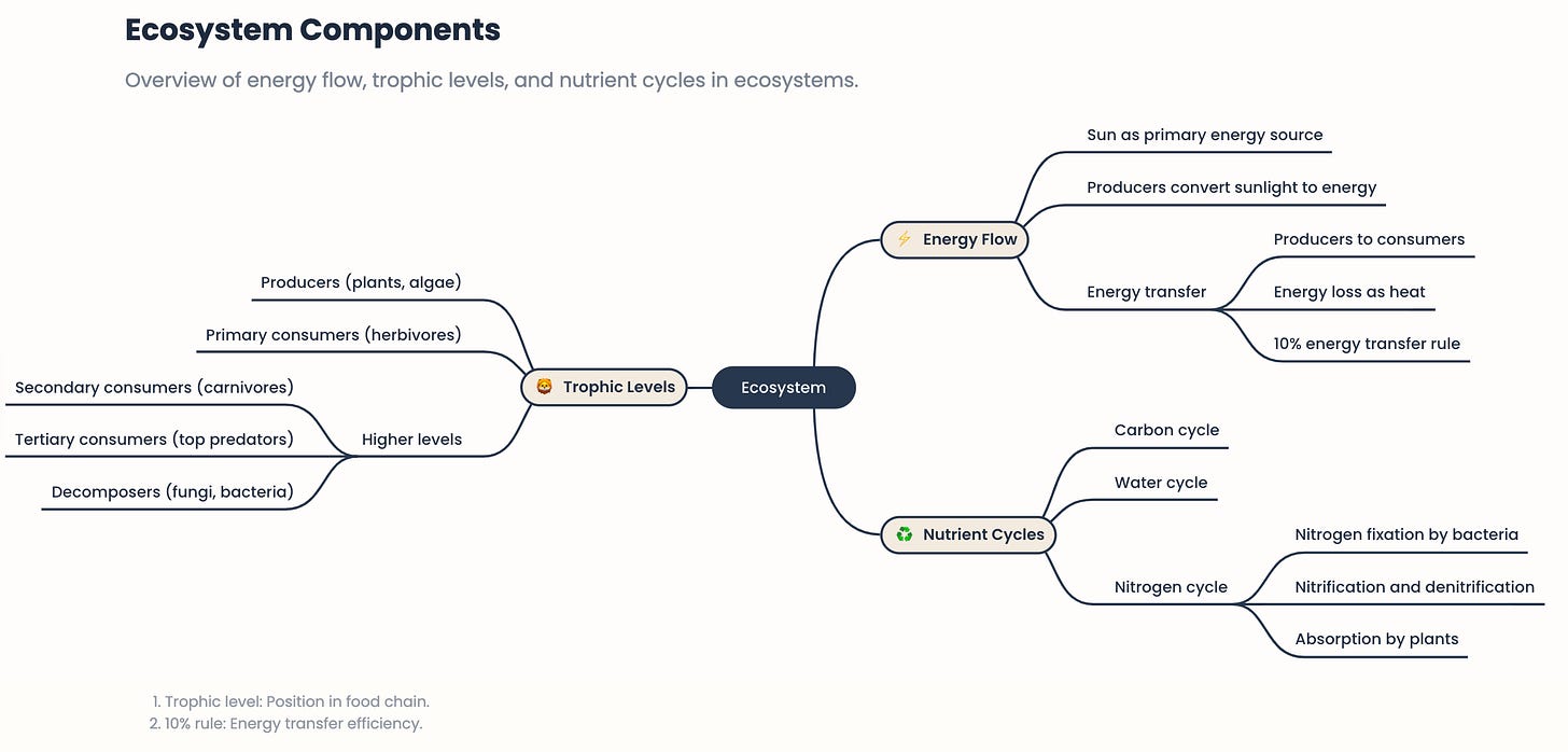 Construct a mind map of ecosystems (energy flow, trophic levels, cycles) appropriate for a middle school classroom lesson.