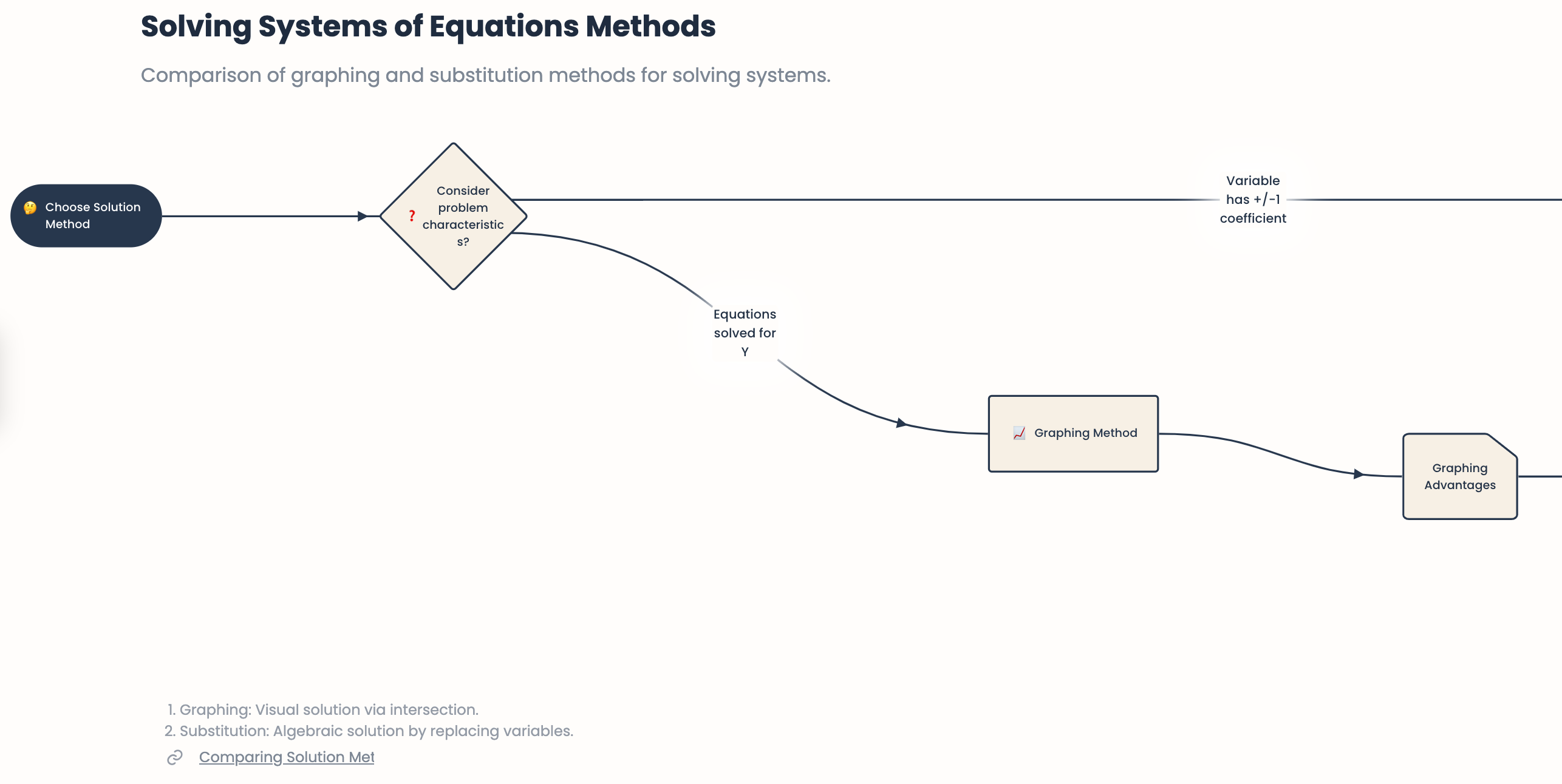 Next, I asked MyLens to build a flowchart for choosing a factoring method or solving systems of equations (graphing vs. substitution vs. elimination). Students can annotate each branch with worked examples.